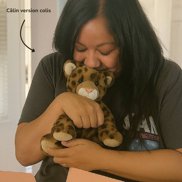 Saphir adore se blottir dans les bras de son humain préféré. Une peluche unique à adopter sans hésiter 🐆💖.